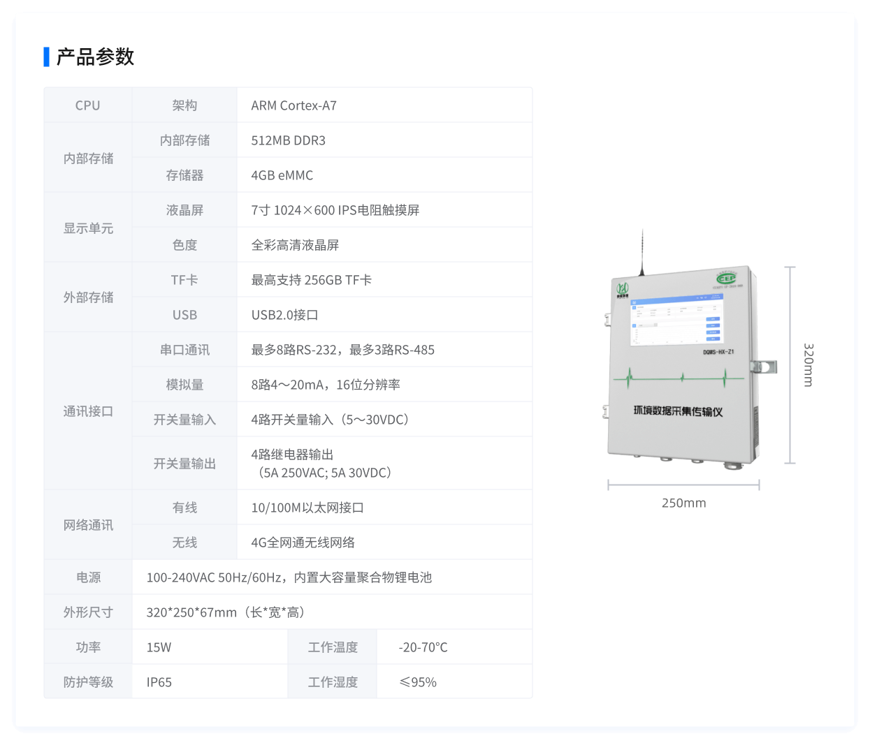 “DQWS-HX-Z1”环境数据采集传输仪是过程监控及排污监控中不可或缺的数据采集传输设备,它实现环保部门对环境处理设备的运行监控以及对环境自动监测设备的数据采集、存储、传输等功能。 充分考虑各行业应用,端口充足,提供模拟量、数字量、开关量等多种接入方式,对采集数据进行转换存储,提供实时数据和历史数据多种查询方式,支持国标(HJ/T212-2005)(HJ477-2009)HJ/T212-2017等传输协议和《污染源在线自动监控(监测)数据采集传输仪技术要求》,符合各地方省市相关标准。 扫码无缝对接恒星公司自主研发的监测小程序“智慧星控”。实现远程实时及历史数据、曲线、台账等查询,具备一键报表及台账打印,趋势分析等实用功能。 能主动和被动接收指令、上传监测数据、控制设备运行、 反馈运行状态和预警信息等功能;具备可靠性设计、大存储容量、冗余通讯机制、超强环境适应能力。性能稳定、操作便捷,广泛应用于石油化工、水利、工业企业等。