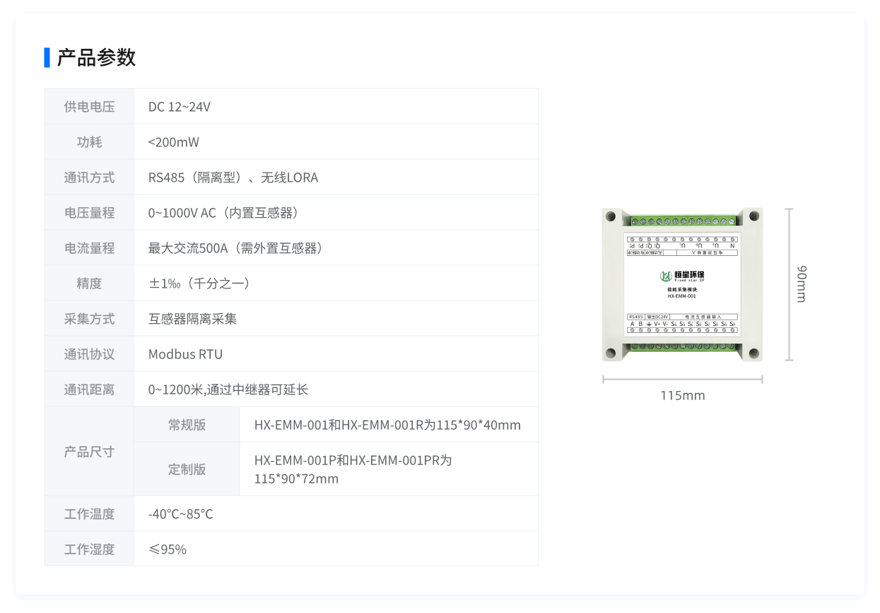 “HX-EMM-001”型能耗采集模块可准确测量三相三线制或三相四线制交流电路中的用电参数、瞬时数据、能量数据。 可广泛应用于各种工业控制与测量系统及各种集散式/分布式电力监控系统,具有性价比高、可靠性好等特点。采集的数据可通过RS485有线连接或者LORA无线连接传输至上位机。 本系列有内置供电、外置供电、无线LORA、RS485等组合型号,多种采集电压和电流量程,可根据现场需求选择或定制配置。