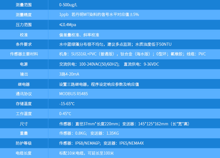 HBA-101蓝绿藻传感器是利用蓝绿藻在光谱中有吸收峰和发射峰这一特性, 发射特定波长的单色光照射到水中, 水中的蓝绿藻吸收该单色光的能量, 释放出另外一种波长的单色光, 蓝绿藻发射的光强与水中蓝藻的含量成正比 。