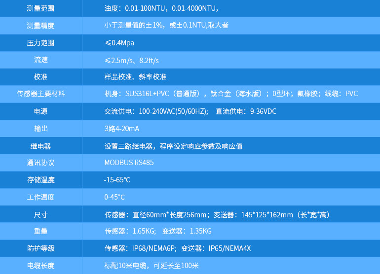 TU-100浊度传感器基于组合红外吸收散射光线法,光源发出的红外光经过祥品中浊度的散射,最后由光电检测器转换为电信号,并经过模拟和数字信号处理后获得样品的浊度值。