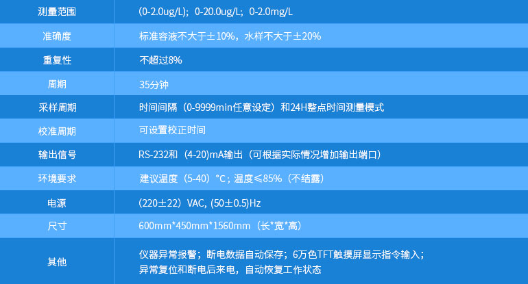 灵敏度高,检出限达到纳克级(ng),采用冷原子荧光法,检测方法可靠,测量线性好,全自动无人值守,操作简单。