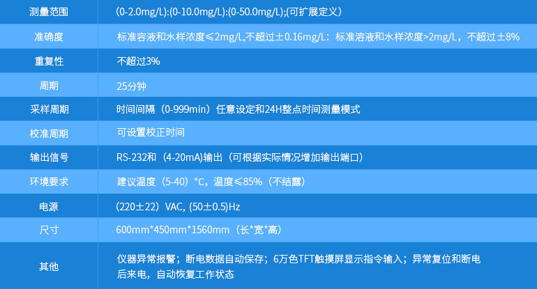试剂环保,配制方使,定量精确,数据稳定,灵敬度高,检出限低,三个量程自动切换,亦可锁定量程,维护周期长。