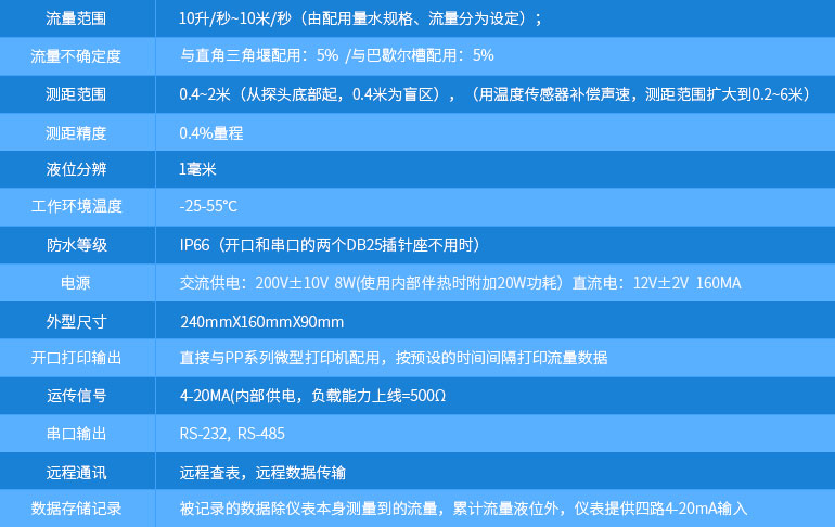 该系列产品直接测量的物理量是液位。仪表采用回声测距法测液位,校正棒用来补偿声速随温度的变化。用于明渠测流量时,在明渠上安装量水堰槽。量水堰槽将明渠内流量的大小转成液位的高低。量水堰槽把明渠内的流量改成对应的液位值。仪表测量水堰槽内的水位,再按相应量水堰槽的水位一流量关系反算出流量。