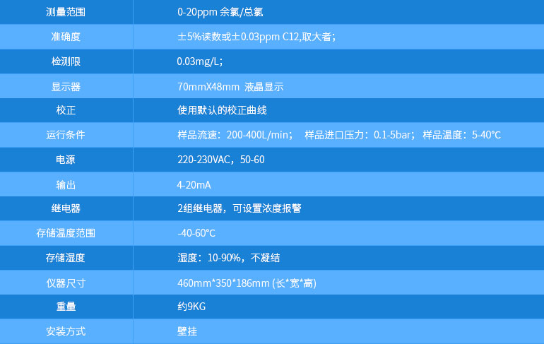 适合自来水、 循环冷却水、 污水等加氯消毒过程的余氯测量和自来水管网的余氯测量。
